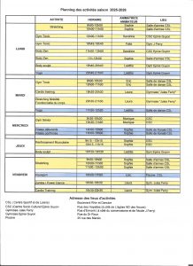 La saison sportive 2025/2026 débute le lundi 15 Septembre 2025 et se termine le 26 juin 2026 pour les activitées en salle.